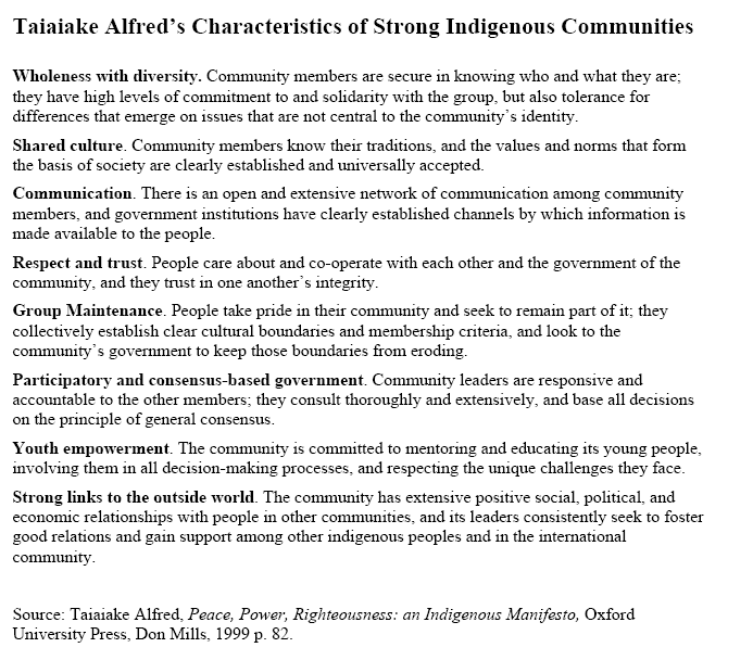 Alfred Taiaiake (1999) presented a clear description of healthy Aboriginal communities who are ready to engage in traditional self government. He describes strong aboriginal commmunities through a variety of traits including the following